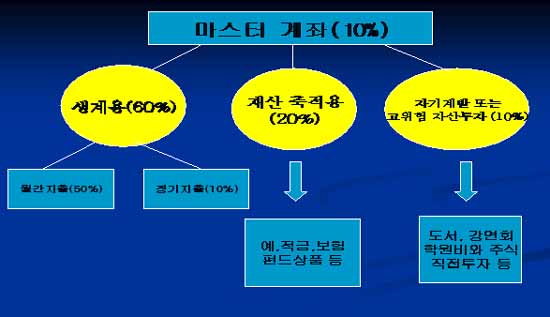 지난주에 말했듯 '마스터 계좌' 는 모든 계좌를 통제하는 중앙회로와 같은 역할을 한다. '돈 댐' 혹은 돈을 모아두는 저수지 역할을 하여 목돈을 만드는 계좌다. 가능하면 인출하기 어려운 계좌 (은행이 멀리 있거나 현금인출카드가 없는 계좌)로 만들기 바라며 요즘 유행하는 'CMA 통장' 을 권하고 싶다.
