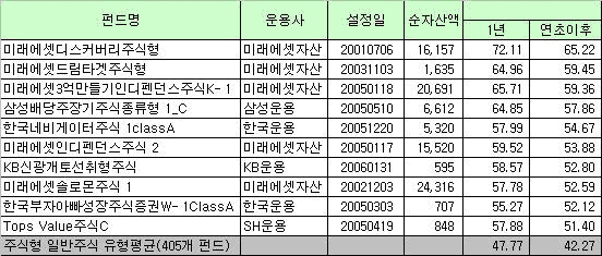 2007년 연초 이후 국내 주식형펀드 중 가장 수익률이 좋은 펀드는 '미래에셋디스커버리' 로 연초 이후 수익률이 무려 65.22%를 기록했다.