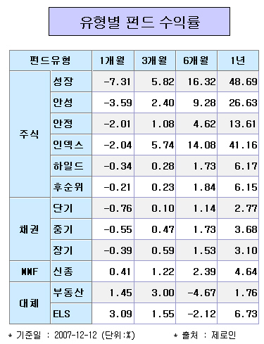 따라서 2008년도의 투자의 맥은 펀드상품에 대해서 적어도 여유자금의 40%이상의 비율로 투자를 하기는 하되 분위기에 편승해서 이것저것 가입하거나 수수료나 보수를 따져보고 최근 1개월, 3개월, 12개월,설정일 이후 등의 기간별 수익률을 함께 비교해보면서 시장이 조정기일 때에도 수익률의 큰 변화 없이 나름대로의 수익률을 지키는 펀드위주로 투자해야 하겠다.