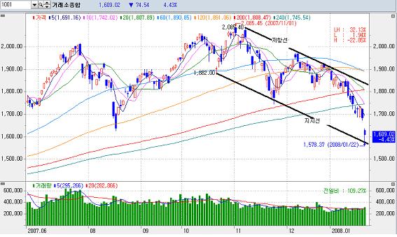 그리고 폭락은 바로다음날인 22일 더 큰 폭락을 만들어 1609포인트까지 떨어졌다. 장중 한때 1600포인트도 무너져 1578포인트까지도 떨어졌다가 그나마 종가에 좀 올라간 지수가 그렇다. 전일대비 74포인트가 하락했다.
