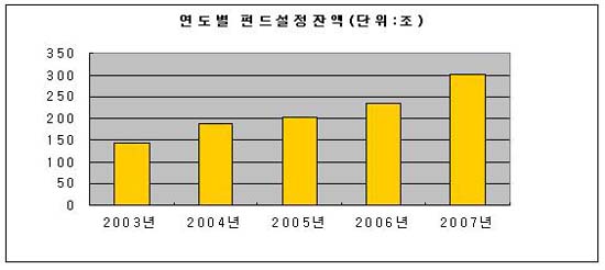 펀드가 저금리시대의 대안으로 떠오르면서 펀드계좌수도 2천만계좌를 훨씬 넘어섰다. 펀드설정잔액도 해마다 증가하여 IMF 외환위기 직후 90조에 불과하던 펀드규모가 2007년 말 기준 300조를 돌파했다. 2007년 주식시장의 활황과 해외펀드 비과세 조치가 큰 역할을 했다.