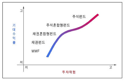 펀드는 크게 주식형, 혼합형, 채권형, MMF의 네 가지로 나눌 수가 있는데, 주식형은 주식에 60% 이상, 채권형은 채권에 60% 이상을 투자한다(펀드 분류 기준은 펀드 평가기관에 따라 조금씩 차이가 있다). 이 같은 분류는 펀드의 '위험' 에 따른 것이며, 주식 편입 비율이 높을수록 펀드 수익률 변동 폭이 크고 위험이 높다. 흔히 말하는 'High-Risk, High Return(고수익에는 높은 위험이 따른다)' 이라는 의미이다.