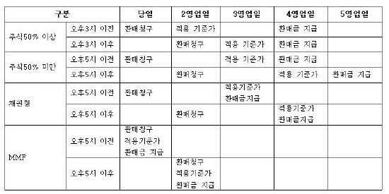 간접투자증권 매입시 적용기준처럼 주식 편입비율이 50% 이상인 펀드의 경우, 주식시장 종료시점(오후 3시) 전에 환매를 신청하면 다음 날 기준가격으로 돈을 찾을 수가 있다. 그러나 오후 3시 이후에 가입신청을 하면 이틀 후에 매입이 된다.
