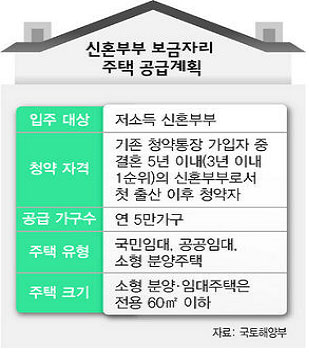 ![]() 국토부는 신혼부부 보금자리 주택을 연간 신규 공급주택의 10%인 5만가구 정도 공급하기로 했다 .별도의 신혼부부용 청약통장을 신설하지 않고 현행 청약예.부금과 청약저축 통장 가입자를 대상으로 한다. 정부는 다만 당초 여성을 기준으로 34세 미만으로 계획했던 연령제한도 두지 않기로 했다. 예비 신혼부부나 결혼 5년 이내의 신혼부부라면 빠르면 이르면 2008년말부터 선보일 신혼부부용 주택을 공략하는 것이 좋다. 신혼부부에게 공급할 주택으로는 △국민임대주택 △공공임대(10년 임대) △전세임대주택 △지분형 주택 △전용면적 60㎡ 이하 소형 분양주택이다. 구체적인 청약 자격은, 기존 청약통장 가입자 중 △결혼한 지 5년 이내(3년 이내 1순위) △출산 후 청약등 이다. 정부가 밝힌 신혼부부 주택 5만가구 중에는 임대주택이 3만5000가구고, 분양주택이 1만5000가구다. 임대주택은 국민임대주택이 2만가구, 전세임대주택이 5000가구, 장기임대주택이 1만가구다. 신혼부부용 임대주택인 전세임대주택 5000가구와 장기임대주택 1만가구는 서울시에서 내놓은 장기전세주택인 시프트 모델을 따를 것으로 보인다. 또 신혼부부가 기존 주택을 구입하거나 임차할 경우에는 연 7만 가구에 한해 저리의 자금이 지원된다. 결론적으로 결혼한 지 5년이 지나지 않고 반드시 첫 아이를 낳아야 청약자격을 얻을 수 있다.물론 무주택자여야 한다. 이 때 결혼한 지 3년 안에 첫 출산을 한 신혼부부가 1순위 청약자격이 주어진다.결혼 4~5년차 1자녀 가구는 2순위로 신청할 수 있다. [박상언 유엔알 컨설팅(www.youandr.co.kr)대표]