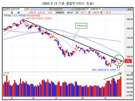 추석연휴로 월요일이 휴장이었기 때문에 지난 주 주식시장은 4일만 열렸는데 그중 2일이 사이드카로 증시가 급등락했다. 9월15일 미국발 신용위기(리먼브라더스 사태)로 급락했고, 미정부의 신속한 대응으로 급등했다. 그로인해 우리 시장은 9월 16일은 선물가격 5%이상 '급락'으로 사이드카가 발동되었고 결국 종합주가지수의 종가는 전일보다 90.17p가 하락한 1387.75p로 마감하였다. 반면에 3일 뒤인 9월19일에는 장중 선물가격이 5%이상 '급등'하며 사이드카가 발동되었고, 종합주가지수는 전일보다 63.36p 오른 1455.78p로 마감하였다. 한마디로 지옥과 천당을 왔다갔다 했던 힘든 시간이었다.
