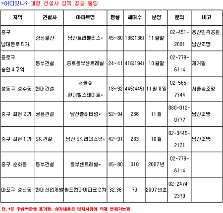 대부분의 신규공급물량이 강북에 몰려있고 이와같은 현상은 내년까지 지속될 것으로 보인다. 내년까지 나올 신규분양물량은 개발호재를 따라 나오고 있다고 해도 과언이 아니다. 판교공급도 완료됐고, 재건축을 제외하고는 강남권은 대형 개발호재가 없는 실정이다. 반면 강북은 서울시의 강력한 개발의지에 각종 호재들로 들썩거리기 때문이다. 가장 큰 호재는 용산개발계획이다. 미군기지 이전에 따른 108만평 대규모 개발계획, 용산과 뚝섬을 기점으로 하는 유턴(U-Turn) 프로젝트 등이 포진돼 있다. 이러한 용산개발여파가 공항철도가 예정된 서울역 주변까지 호재의 여파가 미칠 것으로 보여진다. 여기에 곳곳에 노후주택재개발 및 뉴타운 등 주거환경개선사업이 진행 중이거나 예정돼 있다. 대형건설사들은 이러한 대규모 개발현장에 자신들의 브랜드가 랜드마크 기능을 하기 원하기 때문에 강북으로 눈을 돌리는 것이다. 또한 입지선정을 까다롭게 하고 대형건설사들끼리 경쟁을 하게 될 경우, 차별화를 위한 시도로 상품의 값어치도 높아지게 된다. "판교낙첨자 및 새로운 투자처를 찾는 수요자들은 강북권을 주목할 만다. 단 일반아파트는 단지규모를 주상복합아파트는 조망권 등을 중점으로 옥석을 가려야 한다. ![]() = 작년 목동트라팰리스를 성공적으로 분양완료한 삼성물산이 용산생활권내에 '남산트라팰리스'를 연이어 내놓는다. 2009년(예정) 완공되는 공항철도의 종착역 서울역이 도보 5분거리 이며, 45~80평형 136세대가 공급된다. 남산트라팰리스는 최고 37층 높이의 주상복합아파트로 저층에서도 '용산민족공원'과 '남산' 조망이 가능하며 고층에서는 '한강'조망이 가능한 '트리플조망권'으로 투자가치가 높다. 더불어 해당 사업지가 용산생활권역에 위치해 뉴타운, 유턴프로젝트, 미군기지이전에 따른 녹지개발 등 용산의 각종 개발호재를 공유할 것으로 보여 관심이 높다. = 동부건설이 종로구 숭인4구역을 재개발 하는 '종로숭인 센트레빌'을 분양 (416가구, 24~41평형)하는데 이중 194가구가 일반 분양된다. 향후 인근 재배발 지역의 개발이 완료되면 대단지 주거메리트가 부각되기 때문에 관심을 가질 만하다. =내달 초 현대건설이 성동구 성수동 옛 KT부지에 짓는 '서울숲 현대힐스테이트' (445가구, 18~92평형)는 유턴프로젝트, 신분당선, 서울숲 등의 호재로 인해 청약자가 몰릴 것으로 보인다. 특히 서울숲 현대힐스테이트는 현대건설이 새롭게 선보인 브랜드라는 점에서 정성을 쏟을 것으로 예상되기 때문에 투자잠재력도 충분하다. = 그 외 내달 남산자락에 SK건설과 쌍용건설이 각각 주상복합 "남산SK리더스뷰" 233세대와 "남산플래티넘" 236세대를 공급할 예정이다. 두 현장 모두 남산조망이 가능하며, 생활편의시설이 풍부하다. 지하철 4호선 회현역과 명동역이 가까이에 있다. 내년초에 동부건설이 중구 순화동에 주상복합 310세대와 현대산업개발이 마포구 성산동에 재건축아파트 70세대를 공급할 예정이다.