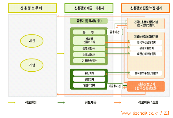 인터넷이란 공공 매체를 통해 컬럼의 형태로 보이기 위한 글을 작성한다는 것은 쓰여진 글에 대한 내면에서의 진정한 이해와 현실의 정확한 인식을 바탕으로 해야 할 것입니다. 또한 쓰여진 글의 방향성에 대해서는 타인의 비판까지를 예상해야 하기에 매우 어려운 일임에는 틀림이 없어 보입니다. 특히, ①신용불량정보 보유자가 400만명을 넘어서는 작금의 현실에 ②신용불량자의 정의조차 모르는 언론을 통해 신용 교육이 이루어지고, 동정적 또는 고식적인 방편이 사회적 대안으로 강요되어 발생되는 매카시적 여론의 충돌은 개인뿐 아니라 사회/국가적으로 큰 손실이란 생각이 듭니다. 따라서 앞으로 제가 주로 다룰 글의 분야는 개인의 신용관리를 통한 잠재적 부의 축적, 나아가 현실의 정확한 인식과 실현 가능성을 바탕으로 사회 제도의 합리적 개선에 대한 내용이 주를 이룰 것입니다. 세부적으로는 ‘1. 개인신용정보 개관, 2. 개인신용평가, 3. 언론/정책에 대한 논평, 4. 신용 회복 제도’에 대한 내용이 주를 이룰 것입니다. 이미 기고된 글이라 하더라도 의문 사항이 있을 시 또는 신용정보에 대한 궁금한 사항이 있을 시 연락을 주시면 추후 반영토록 하겠습니다. 다음(daum)의 재테크 내의 칼럼이 단순히 개인의 재테크로 물질적 부의 축적만을 위한 목적이 아니라, ‘기회의 평등’이란 시각에서 신용 관련 제도의 정비를 통해 사회적 부를 증가시키는 데 다소간의 도움이 될 수 있기를 기원합니다. 그렇다면 첫 회에서는 ‘개인신용정보’에 대해서 알아보기로 하겠습니다. 현재 신용정보는 그 내용의 주체의 성격에 따라, 개인신용정보와 기업신용정보로 나뉘나 법률상으로 명확히 구분되지 못하는 면이 있습니다. 사람은 어떤 물건이나 인위적인 생산물이 아닌 것으로 만약 잘못된 내용이 유통됨에 따른 피해는 분명히 다르기에 관련규정들이 추후에는 구분되어 정비될 필요가 있어 보입니다. 그렇다면 개인신용정보와 관련된 가장 근간이 되는 법률인 ‘신용정보의이용및보호에관한법률’을 통해 그 정의부터 살펴 보도록 하겠습니다. 1.법률적 구분③ 가. 식별 정보: 개인의 성명ㆍ주소ㆍ주민등록번호(외국인의 경우 외국인등록번호 또는 여권번호)ㆍ성별ㆍ국적 및 직업등 특정 신용정보주체를 식별할 수 있는 정보(이는 타 신용정보와 결합된 경우에만 신용정보로 인정함) 나. 거래내용 판단정보: 대출ㆍ보증ㆍ담보제공ㆍ가계당좌예금 또는 당좌예금ㆍ신용카드ㆍ할부금융ㆍ시설대여 등의 금융거래 등 상거래와 관련하여 신용정보주체의 거래내용을 판단할 수 있는 정보. 다. 신용도 판단정보:금융거래 등 상거래와 관련하여 발생한 연체ㆍ부도ㆍ대지급 또는 허위 기타 부정한 방법에 의한 신용질서 문란행위 등 신용정보주체의 신용도를 판단할 수 있는 정보. 라. 신용거래능력 판단정보: 금융거래등 상거래에 있어서 신용도등의 판단을 위하여 필요한 개인의 재산ㆍ채무ㆍ소득의 총액, 납세실적등 신용정보주체의 신용거래능력을 판단할 수 있는 정보. 마. 공공 정보: 금융거래등 상거래에 있어서 신용정보주체의 식별ㆍ신용도 및 신용거래능력을 판단할 수 있는 법원의 심판ㆍ결정정보, 조세 또는 공공요금등의 체납정보, 주민등록에 관한 정보 및 기타 공공기관이 보유하는 정보로서 재정경제부령이 정하는 정보. 바. 기타: 상기와 유사한 신용정보로서 재정경제부령이 정하는 정보 그렇다면 실질적으로 유통되는 개인신용정보에는 어떠한 것들이 있는지 살펴 보도록 하겠습니다. 먼저 실질적인 정보의 형태에 앞서 간단한 개별 기관에 대한 이해가 선행된다면 보다 많은 이해가 가능하기에 잠깐만 개별 기관에 대해 살펴 보도록 하겠습니다. 현재의 신용정보 유통체계를 보게 되면 신용정보종합집중기관인 전국은행연합회(www.kfb.or.kr)가 있고, 업권별 이익을 목적으로 한 신용정보개별집중기관인 생명보험협회(www.klia.or.kr), 대한손해보험협회(www.knia.or.kr), 한국정보통신산업협회(www.kait.or. kr), 여신금융협회(www.knfa.or.kr)가 있습니다. 또한 신용정보업자 중에는 조회업을 허가받은 ④ 6개사 가 있는데, 이에는 Credit Bureau사업을 표방한 한국신용정보(www.nice.co.kr), 한국신용평가정보(www.kisinfo.com) 등이 있습니다. 간단하게 아래와 같은 그림으로 나타낼 수 있을 것입니다. ![]() 신용정보개별집중기관의 경우에는 업권 내에서 폐쇄적으로 운용되므로 이는 생략하고, 대부분의 금융기관에서 이용되는 전국은행연합회와 상거래를 위한 사업자라면 누구든지 볼 수 있는 신용정보업자가 유통시키고 있는 정보에 대해서 개략적인 내용을 살펴 보도록 하겠습니다. 2.전국은행연합회⑤ 가.개인신용거래정보 (1) 개인대출현황(대출일자, 대출금액) (2) 채무보증현황(채무보증일자, 채무보증금액) (3) 가계당좌?당좌예금 개설 및 해지 사실(금액 없음.) (4) 신용카드(신용체크카드) 발급 및 해지 사실(금액 없음.) (5) 신용카드 현금서비스 현황 나. 신용불량정보 (1) 대출금 등의 연체, 용도외 유용사실 (2) 지급보증대지급금(또는 대위변제) 발생사실 (3)신용보증대지급금 발생사실 등. 다. 특수기록정보 신용불량정보가
