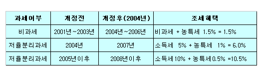 소액주식 직접투자에 대한 조세혜택금융기관을 통하여 주식을 간접투자하지 않고 직접 상장법인이나 등록법인의 주식을 취득하여 1년이상 장기보유하여 상장법인 등으로부터 2006.12.31까지 받는 배당소득에 대해서는 비과세와 분리과세가 연장되었습니다. 직접 투자한 상장법인 등의 주식 액면가액이 5,000만원이하이면 배당소득은 비과세이며, 주식 액면가액이 5,000만원에서 3억원 이하이면 지급받는 배당금의 5%(2003년까지는 10%)로 저율 분리과세 되도록 개정되었다. 소액주식 간접투자에 대한 조세혜택 주식을 직접투자하지 않는 간접투자 형태로 수익증권, 뮤추얼 펀드 및 일임형 랩(Wrap)이 있습니다. 주식 간접투자를 통해서 조세혜택을 받기 위해서는 매1년 동안 평균 60%이상 주식으로 운용되어야 하며 투자액이 8,000만원 이하이면 됩니다. 이 경우 2005.12.31일까지 발생하는 이익에 대하여 소득세를 비과세를 하게 됩니다. 세금우대종합저축 이자의 분리과세 세금우대종합저축이란 계약기간이 1년이상이고 모든 금융기관에 가입한 세금우대종합저축의 계약금액 총액이 1인당 4,000만원(20세 미만인자는 1,500만원, 노인 및 장애인은 6,000만원)이하로 가입하고 당해 저축에서 발생하는 이자소득이나 배당소득은 10%(농특세 포함시 10.5%)으로 저율분리과세하며 종합과세 대상에서 제외됩니다. 이자소득이나 배당소득은 금융소득 종합과세 대상이지만 위에서 살펴본 비과세나 저율분리과세가 되는 상품은 종합과세에 합산되지 않습니다. 그러므로 세후 순이자나 배당을 고려한다면 우선적으로 비과세 상품과 분리과세상품을 먼저 가입하는 것이 좋습니다. |