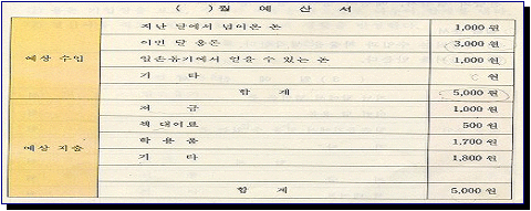 우선, 용돈관리교육의 목표와 기대효과 및 용돈기입장 작성이 왜 필요한지에 관하여 살펴보도록 하자 교육 목표 및 기대 효과 ?일정한 양식과 법칙에 따라 용돈 사용 내역을 기입할 수 있다. ?용돈 사용 예산서와 결산서를 작성할 수 있다. ?합리적인 소비생활과 지출에 따른 책임감을 정립할 수 있다. ?정직한 경제인,지혜로운 소비자,창의적인 생산자,체계적인 투자자의 기틀 을 마련할 수 있다.(올바른 경제인의 기반 구축) 용돈 기입장이 필요한 이유 1. 매일매일의 수입과 지출 내용을 알 수 있다. 2. 매월 정리를 할 수 있다. 3. 예산서와 비교해 볼 수 있다. 4. 매월 평가를 해 볼 수 있다.(책임감 확보)5. 앞으로 계획 세울 때 좋은 참고가 된다. 6. 정직하고 올바른 소비생활을 할 수 있다.(투명성 확보) 그러면,용돈기입장 사용방법에 관하여 예를 보면서 작성하는 방법을 익히도록 하자 ![]() 결산서 만들기 1. 수입을 종류별로 모아서 적고 합계를 낸다. 2. 지출은 크게 용도별로 나누어서 금액을 모아 적고 합계를 낸다. 3. 수입에서 지출을 빼서 잔액을 구해 적는다. ![]() 예산서 만들기 1. 지난 달에서 넘어온 돈과, 한달 동안에 얻을 수 있는 돈을 생각해서 들어올 돈을 예상한다. 2. 한달 동안에 반드시 써야 할 곳을 생각하여 예상되는 지출을 적는다. 3. 예상되는 수입과 지출의 합계를 내어 본다. 예산서 작성 (예) ![]() (문1) 다음은 용돈에 관한 설명이다. 옳지 않은 것은? 1.용돈은 모든 어린이에게 필요하다. 2.용돈은 분수에 맞고 보람 있게 써야 한다. 용돈의 액수는 모든 어린이가 같아야 한다. 4.용돈은 가계비의 일부분이다. 다음 문장들은 참(T)일까요? 거짓(F)일까요? (문2) 용돈의 크기와 범위는 지급전에 아이와 협의(협상)를 한 후 결정해야 한다. (T / F) (문3)아이들은 용돈이 필요하며, 그 돈의 사용(지출)은 스스로 결정하도록 해야 한다. (T / F) (문4) 학교에서 공부를 잘한 것에 대한 보상을 하거나, 아이의 행동을 통제 하기 위해 돈을 사용하는 것은 좋은 방법이다. (T / F) (문5)가족의 경제적, 사회적 목표를 결정하는데 10대 자녀를 참여 시킬 필요는 없다. (T / F) (문6) 가게에서 아이에게 물건값을 치르게 하는 것은 아이에게 돈의 용도와 가치를 배우게 한다. (T / F) (문7) 아이들은 지출, 이웃 돕기, 저축의 경험을 통해 돈을 관리하는 법을 배우게 되므로 스스로 할 수 있도록 장려해야 한다. (T / F) 정답) (문1) 3 (문2) T (문3) T (문4) F (문5) F (문6) T (문7) T |