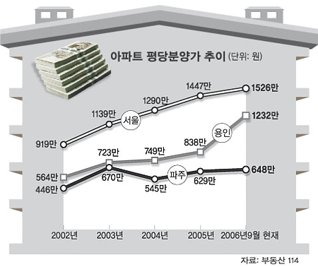 11.15 대책 이후 급등했던 아파트 가격 상승율이 눈에 띄게 둔화되고 있고 일부 지역에서는 매물이 쌓이고 있다. 이와 같은 아파트 값 변동율만 놓고 볼 때, 11.15 대책이 아파트값 안정화에는 상당부분 기여를 하고 있는 것만은 틀림 없다. 또한 시중은행들의 주택 담보 대출 규제와 금리 인상 , 민간경제연구소가 잇따라 버블 붕괴 우려를 피력해, 급등했던 주택시장이 하락하는데 일조를 하고 있다. 하지만 단기간에 급등했던 것에 대한 추격매수 부담감,계절적인 비수기와 맞물려 상승세가 잠복해 있을 뿐, 전적으로 안심할 단계는 아니다. 참여정부 들어 재건축ㆍ재개발을 비롯한 정부의 각종 주택건설 규제로 장상적으로 주택공급이 이루어지지 않아 집깂 상승에 일조를 했다. 가구수로만 보면 대략적으로 30만가구가량의 공급부족을 불러왔다. 구체적인 정부관계자의 말을 인용해 보면 "지난 2002년 이후 부동산 값 급등의 주요 원인은 매년 30만가구 이상의 주택공급이 필요했음에도 실제로는 20만가구에 그쳐 매년 10만가구, 2003년부터 2005년까지 3년 동안 총 30만가구의 공급물량이 받쳐주지 않았던 데 따른 것으로 분석됐다"며 "이 같은 공급부족은 주택건설 규제가 강화된 데 기인한 것으로 파악됐다"고 말했다. 이와 함께 주상복합 건물의 주택건설 비율이 이전 90%에서 70%로 낮아지고 오피스텔은 사무실과 주거시설 비율이 5대5에서 7대3로 낮아진 점, 다가구ㆍ다세대주택 건설시 필요조건으로 주차부지 확보를 강화한 점 등을 공급부족의 원인으로 꼽았다. 정부 핵심 당국자의 이 같은 발언은 참여정부가 추진해왔던 수요억제 중심의 정책이 실패했음을 다시 한번 확인해주는 것이다. 황금돼지해로 표현되는 2007년 주택시장은 어떻게 전개될 것인가 독자들과 함께 생각해 보고자 한다. 집값 하락에 대한 전조 -민간경제연구소의 ' 버블 붕괴 우려 강력 피력' 현대경제연구원이 경제 위기 요인으로 '버블 붕괴' 가능성을 지목한데 이어 최근 삼성경제연구소, LG경제연구원 등도 집값 거품을 경고하고 나섰다. 특히 LG경제연구원은 '국제통화기금(IMF) 위기 전후 한국 경제와 생활여건 변화' 보고서 에서 "외환위기 10년만에 또 다른 위기설이 흘러나오고 있으며 그 진원지는 부동산 가격 거품 붕괴에 따른 가계대출 부실"이라 고 경고했다. 금융연구원도 '가계금융 부실 억제 필요성과 방안'이라는 보고 서에서 "경기 하락기에 급격한 금리인상이 이뤄질 경우 부동산 거품이 일거에 꺼질 수 있어 금리 조정을 점진적으로 실시해야 한다"고 지적했다.권오규 경제부총리도 이달 초 "집값 거품 붕괴가 가계 위기로 이어질 수 있다"는 의견을 내놓은 바 있다. 이같은 의견은 대체로 "급격한 금리 인상"을 전제로 하고 있어, 선거를 앞두고 경기 부양카드를 내놓아야 하는 정부입장으로서는 가능성이 낮다. -금융권 통한 전방위적인 압박 수도권 투기과열지역의 6억원 이상 고가 아파트가 아니라도 총소득의 40% 이상으로 대출상환 능력이 없는 사람은 주택담보 대출에 제한에 걸린다. 즉 빚이 많거나 소득이 적으면 주택담보대출을 받기가 어려워진다는 얘기다. 또 이미 살던 집을 팔기로 하고 주택담보대출을 받아 다른 집을 산 사람은 약속한 기간 내에 빌린 돈을 갚거나 주택을 팔도록 압박을 가하고 있다. 6ㆍ30주택담보대출 제한조치와 8ㆍ31부동산대책 때 발표된 '처분조건부 대출'과 '축소조건부 대출'의 시행 여부를 점검하고 있다. 주택담보대출 등 가계대출 부실에 대비한 은행들의 대손충당금 적립비율을 정상 여신은 0.75%에서 1.0%로, 요주의 여신은 8.0%에서 10.0%로 상향 조정한다. 은행들이 이 조치로 추가 적립해야 하는 대손충당금은 약 8,000억원에 달해 대출 억제는 물론 금리 상승 요인으로 작용할 전망이다. 한국은행이 얼마 전 지급준비율을 인상한데 이어 주택담보대출 금리의 기준이 되는 CD금리도 가파른 상승세를 보이고 있다. CD금리는 지난 10월초 4.58%에서 지난주 4.74%까지 상승했다. 은행들이 가산금리를 손대지 않더라도 기존 대출자들 은 가만히 앉아서 이자부담이 늘어나는 셈이다. 여기에다 각 은 행들이 영업점장 전결금리를 축소하고 실수요자 중심으로 신규 대출을 승인하고 있어 신규 대출 문턱은 더욱 높아져 주택시장으로 흐르는 자금을 차단하고 있다. 이와 같이 금융감독원의 은행권 특별검사를 통한 부동산 대출규제로 인해 아파트시장 안정화에 상당부분 기여할 전망이다. -민간아파트 분양가 상한제 적용 정부와 열린우리당이 1999년 폐지된 민간 부문 아파트 분양가 상한제를 재도입키로 한 것은 집값만은 반드시 잡겠다는 의지에 따른 것으로 보인다. 이번 대책으로 민간 주택 물량이 감소하는 등 부작용이 우려되기도 하지만 , 건설업체들의 분양가 부풀리기를 막아 집값 안정에는 상당한 효과가 있을 것으로 분석된다. 게다가 정부와 여야 일각에서는 '반값 아파트' 공급을 위한 구체적인 방안을 준비 중이어서 향후 부동산 시장이 엄청난 변화에 휩싸일 가능성이 크다. 결과적으로 1999년도에 시행된 분양가 자율화로 인해 아파트 가격은 천정부지로 올랐다. 2006년 10월 현재 서울 신규 아파트 분양가