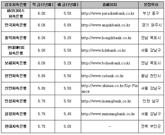 상호저축은행별 금리 BEST 10 (2006년 1월 30일기준)