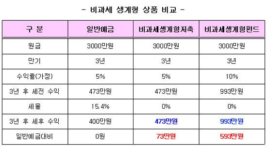 비과세 생계형상품의 종류는 예금과 펀드가 있는데 이자와 배당수익이 모두 비과세 적용 됩니다. 단 남자는 60세 이상, 여자는 55세 이상에 한하며, 장애인, 국가유공자, 기초생활수급자 등으로 가입 대상에 제한이 따릅니다. 가입한도 역시 1인당 3000만원으로 제한됩니다.