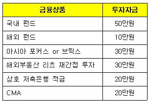 우선 청약저축 10만원과 교원공제 30만원을 그대로 유지하는 것으로 하고, 총 투자 자금 160만원에 대한 투자 포트폴리오를 구성했습니다.