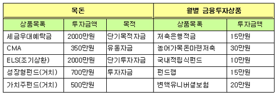 전세자금 1300만원, 채무 2000만원, 정기예탁 2000만원, CMA 1250만원, 일반저축 300만원으로 총 6850만원의 목돈과 150만원 정도의 월수입 중 95만원을 적금, 연금, 펀드, 종신보험 등의 금융상품에 투자를 하고 있습니다.