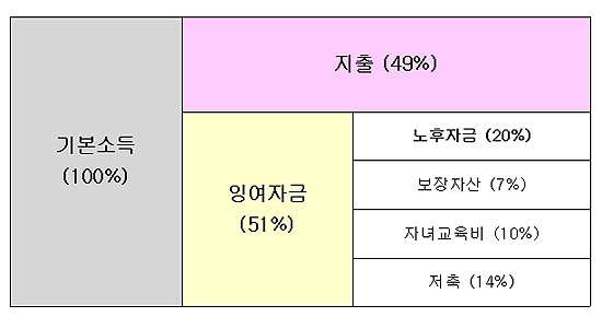 기본소득에서 지출 비용을 제외하고 남는 자금을 잉여자금이라고 합니다. 이 잉여자금으로 노후 준비를 하고, 자녀 교육도 시키고, 저축을 통해 집도 사고, 차도 삽니다. 여기서 중요한 것은 51% 이상의 잉여자금의 효과적인 배분과 우선순위 입니다.