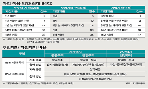 최근 새로 바뀐 청약제도 주요 내용 무엇보다도 올 가을 내집마련에 성공하기 위해서는 최근 바뀐 청약관련법을 잘 숙지하고 있어야 한다.우선, 빠르면 오는 11월 이후 분양되는 단지부터 서울지역 아파트(주상복합 포함)를 분양받으려면 입주자모집공고일로부터 1년 이상 서울에서 살아야 한다. 현재는 입주자모집공고일 현재 서울 거주자면 청약할 수 있다. 건교부가 최근 주택공급에 관한 규칙 개정안을 입법예고했기 때문인데, 서울을 포함한 수도권 투기과열지구에서는 지역우선공급분의 거주기간을 1년 이상 제한하도록 하는 내용을 담고 있다. 또한 10월말부터 송도·청라·영종지구 아파트에 서울지역 거주자도 청약할 수 있게 된다. 지금까지 인천지역 거주자에게만 공급되던 송도·청라·영종지구 아파트는 서울과 수도권거주자에게도 70% 물량이 배정된다. 송도 등 경제자유구역내 공급주택의 지역우선공급물량을 100%에서 30%로 줄였기 때문이다. 이는 택지개발촉진법에서 66만㎡이상 대규모 택지개발때 지역우선공급물량을 30%로 한정한 것과 형평성을 맞추기 위한 것이다. 현재 공공택지 아파트에만 적용되는 재당첨금지제도가 점차 민간아파트로 확대 적용된다. 본인이 청약한 아파트에 당첨될 경우도 5∼10년간 전국 모든 아파트에 청약을 신청할 수 없는데 공공택지의 경우 7∼10년, 민간택지는 5∼7년간이다. 현재 , 금융결제원과 시중 은행, 대부분의 민간 부동산 포털 업체 등 인터넷 홈페이지에 '청약가점 계산' 코너가 마련돼 있다. 가점을 잘못 기재했을 경우 상당한 불이익이 따르기 때문에 충분한 모의 연습을 거친 후, 본인의 점수에 맞춰 당첨 확률이 높은 유망분양단지를 고르는 것이 좋다. 정부의 주택공급 로드맵에 따르면 매년 수십만 가구가 쏟아질 예정이기 때문에 가점이 낮다고 미리미리 포기 하지 말고 차근차근 청약가점을 쌓는데 주력해야 한다. 물론 아직 청약 통장이 없는 경우, 하루라도 빨리 청약통장에 가입해 분양가 상한제가 적용되는 유망물량을 기다려야 한다. 최근에 지방 투기과열지구도 추가적으로 해제되었다. 일정기간내 재당첨 금지 기간이나 2주택자의 1순위 청약금지가 해제되었지만 대부분의 지방은 미분양 풍년을 맞고 있기 때문에 실수요 위주로 신중하게 접근해야 한다. 정부의 주택담보대출 규제로 사전에 가용 자금 여력을 체크한 이후에 청약하여야 낭패를 보지 않는다. 자금을 마련하지 못해 계약을 취소할 경우, 일정기간동안 청약을 할 수 없기 때문이다. 청약 가점제 시행 후 청약 전략 분양시장을 통해 내집마련에 성공하려면 청약 점수를 높이는 방법을 연구해야 하는데 그 중에서 1명당 5점이 주어지는 부양가족수를 늘리는 방법이 최고다. 가령 ,입주자 모집 공고일 기준으로 부모는 3년 이상 모실 때 반영되고 가구가 분리된 30세 이상 미혼 자녀의 경우, 1년 이상을 같은 집에서 지내야 부양가족 점수에 포함된다. 유주택자는 가점이 높아도 2순위로 청약 순위가 밀려 불리하다. 다만 1주택자는 가점제가 아닌 추첨제로 공급되는 주택에 대해서는 1순위 자격이 유지된다. 2주택 이상 보유자는 모든 주택에 2순위 이하로만 청약할 수 있다. 또 주택 1채당 5점씩 감점된다. ![]() 구체적으로 바뀐 청약관련법을 살펴보면 85㎡ 이하 민영 아파트의 경우, 가점제는 75%, 나머지 25%로 추첨제로 당첨자를 가린다. 청약예금 가입자 대상의 전용 85㎡ 초과 중대형아파트의 50%는 추첨식이므로, 청약저축·부금보다 당첨 확률이 높다. 채권입찰제를 우선 적용한 뒤 채권매입 예정금액이 같을 경우 가점제와 추첨제를 각각 50%씩 적용해 당첨자를 정하기 때문이다. 청약가점은 △무주택기간(2∼32점) △부양가족 수(5∼35점) △청약통장 가입기간(1∼17점) 등 최고 84점이다. 무주택기간 가점은 1년 경과할 때마다 2점씩, 부양가족 수는 1명 늘 때마다 5점씩, 청약통장 가입기간은 1년 경과할 때마다 1점씩 올라간다. 무주택 기간은 청약통장 가입자의 연령이 만 30세 이상부터 산정된다.가입자가 만30세 이전에 혼인한 경우는 혼인신고 일부터 계산한다. 30세미만에 결혼한 경우는 그후 이혼하고 재혼하지 않았더라도 호적등본상 혼일 신고 일부터 무주택기간을 산정한다. 1년 미만일 경우 2점, 1년이 늘어날 때마다 2점씩 가산된다. 무주택 기간이 15년 이상일 경우 최대 점수를 받는다. 무주택자는 입주자 모집 공고일 기준으로 세대원을 비롯해 주민등록표 상 전세대원이 주택을 소유하지 않아야 인정받는다. 60세 이상 부모의 주택 소유 여부도 따져봐야 한다. 만60세 이상의 직계존속이 주택을 소유한 경우 청약통장 가입자는 무주택자로 간주된다. 그러나 만60세 이상의 직계존속이 2주택이상을 소유한 경우 1주택을 초과하는 주택마다 5점씩 감점된다. 60세 이하 부모가 집을 한 채 갖고 있으면 1주택자로 분류돼 2순위가 된다. 기존에 주택을 소유한 적이 있다면, 주택 처분 이후부터 기간이 산정된다. 이미 집을 갖고 있더라도 무주택자로 인정받는 경우는 60㎡ 이하, 주택 가격 5000만원 이하 소형, 저가 주택일 소유하는 경우 60㎡ 초과주택을 청약하는 경우는 무주택으로 인정된다. 또한 집