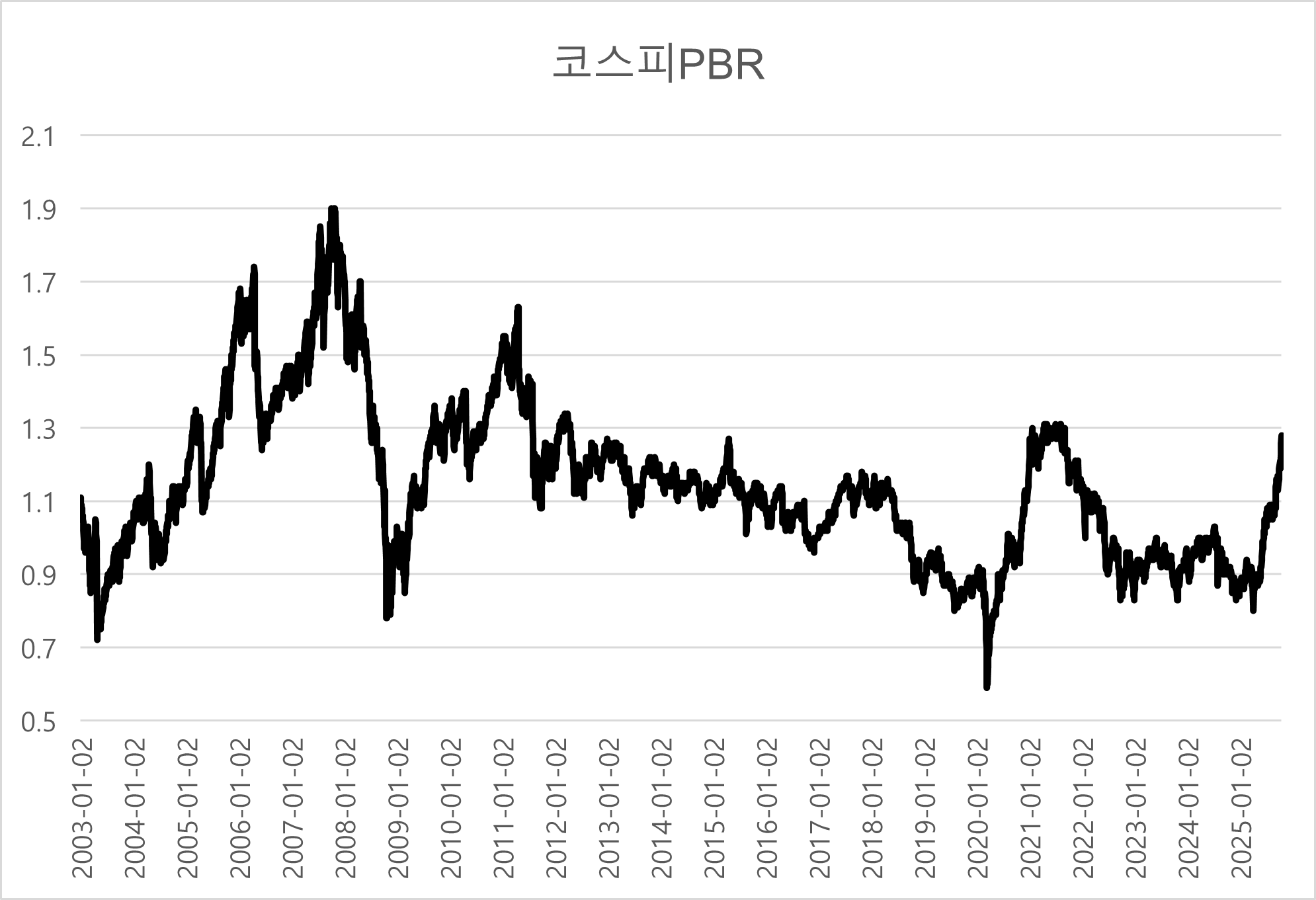 2020년과 2021년 동학개미 운동 속에 증시로 자금이 머니무브되던 때 한국 코스피 PBR은 2020년 연초 0.88배에서 2021년 여름 1.31배까지도 치솟았었습니다. 현시점에서 한국증시로의 머니무브가 아직 본격화되지도 않은 것을 고려한다면 2021년 여름 수준을 넘어갈 개연성을 가지고 있다 할 수 있겠습니다.