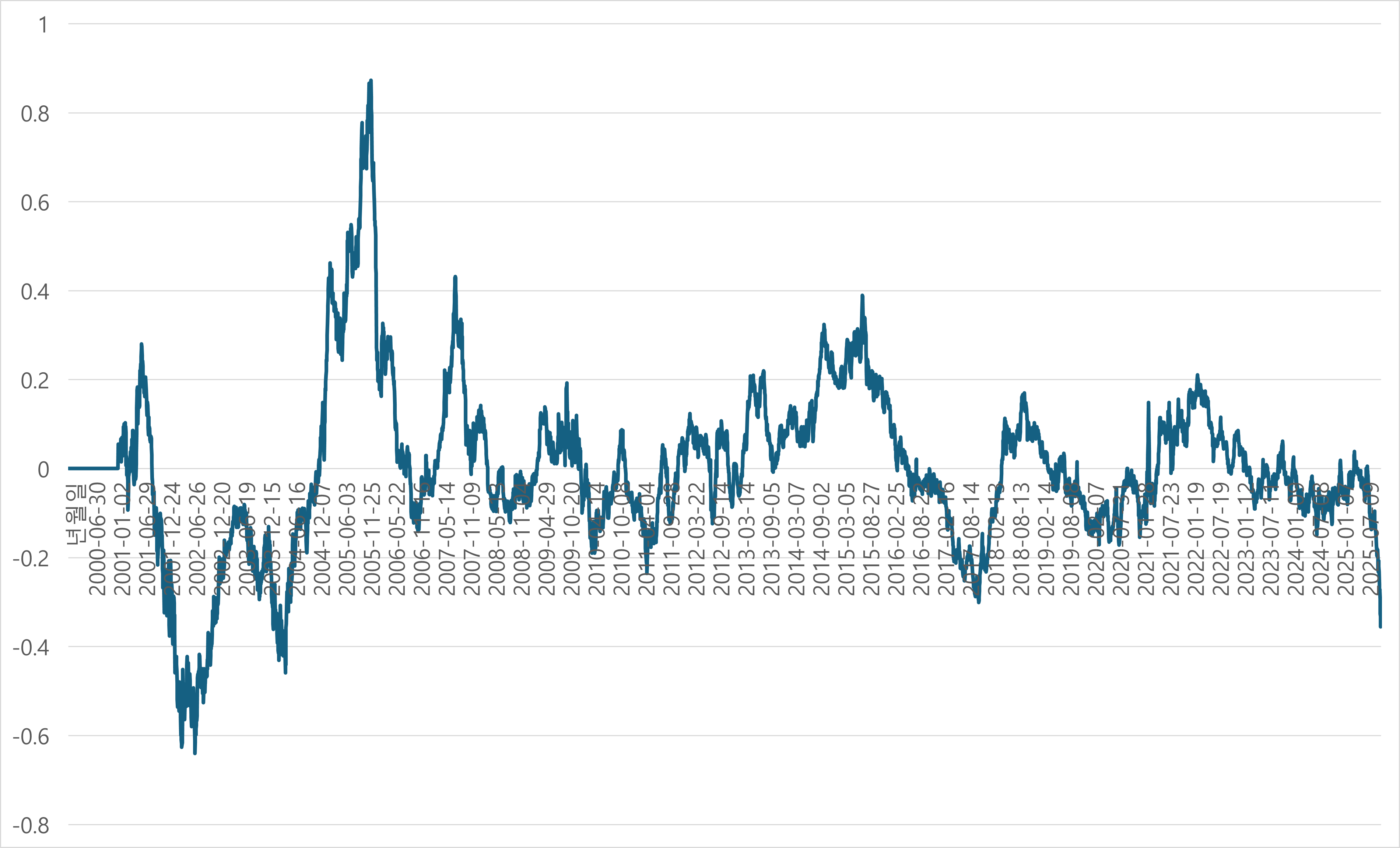 ■ 대략 3년여 지속되고 있는 코스피 지수의 상대적 강세 : 그 절정 속 2025년