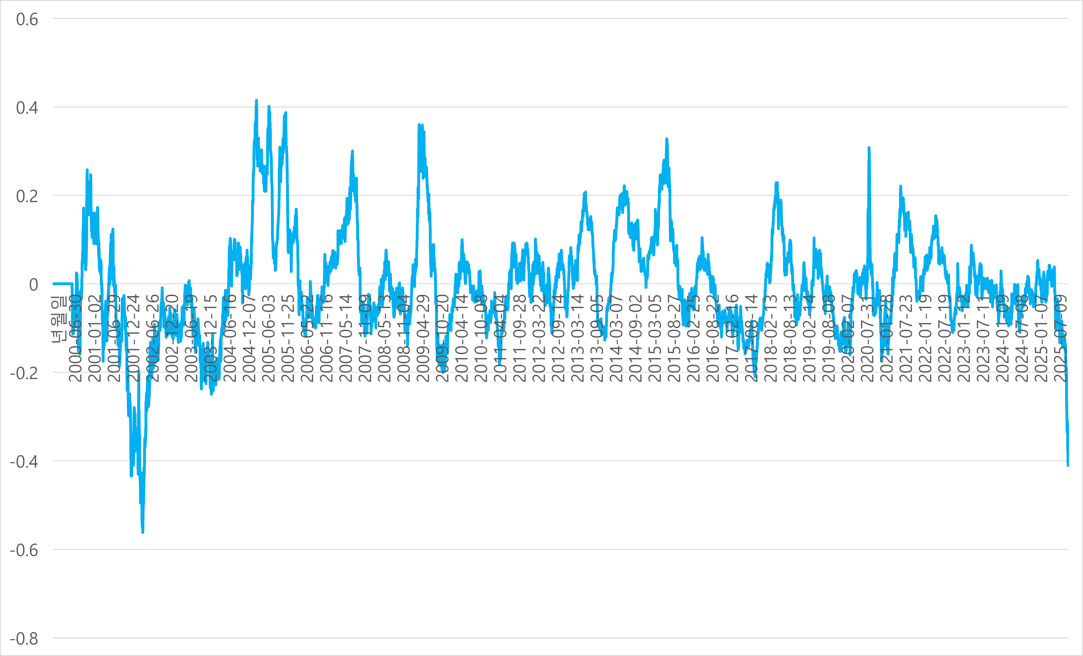 위의 도표는 2000년 이후 2025년 최근까지의 소형업종 지수의 240일 수익률(모멘텀) 코스피 지수 대비 상대 수익률을 보여주고 있습니다. 해당 도표가 위로 올라가거나 플러스 영역에서는 개별 종목의 대표 지수라 할 수 있는 소형업종 지수가 코스피 지수보다 우위에 있던 시장이고, 하락세 또는 마이너스 영역에서는 코스피 지수의 차별화 장세로 개별주가 힘들었던 시기로 해석 해 볼 수 있습니다.