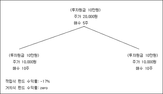 똑같이 우여곡절 끝에 주가가 원상복구 되더라도 첫 번째 그림은 주가가 떨어졌다가 나중에 올라가게 되면 중간에 싸게 산 주식 덕분에 전체적으로는 이득이 발생하게 된다. 하지만 두 번째 그림처럼 주가가 먼저 올라갔다가 나중에 떨어지면 중간에 비싸게 산 주식은 가격이 하락해 손실을 보게 된다. 결국 적립식 펀드가 모든 위험을 해결해 주는 것은 아님을 알 수 있다.