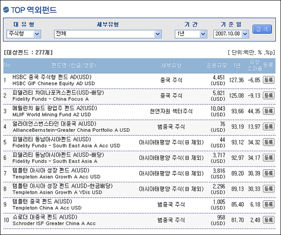 펀드 평가사 '제로인'의 조사에 따르면역외펀드 상위에 선정된 10개 펀드 가운데 절반이 중국 증시에 투자되는 펀드들이었다.